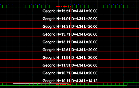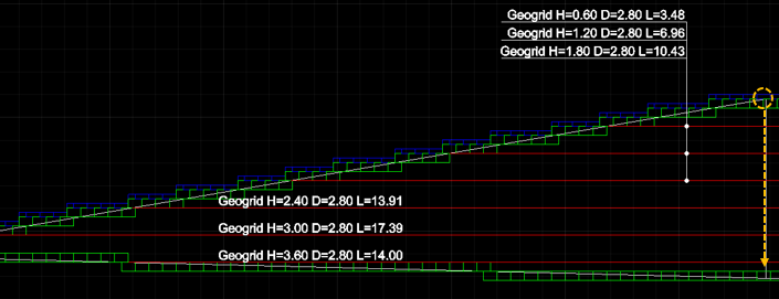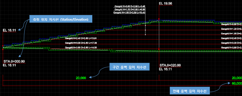 - 보강재 높이 계산 방향이 “블록/패널의 최상단에서 아래로”인 경우 횡단면도는, 각 측점별 / 각 단별로 최상단 블록 또는 패널의 상단고를 기준점으로 계산합니다.