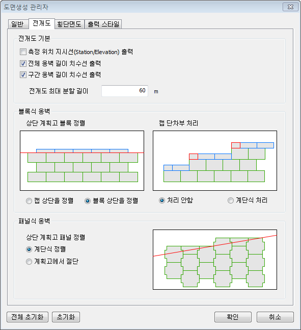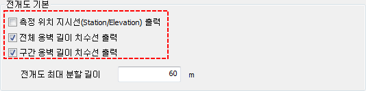 - 측점 위치의 지시선(Station/Elevation) / 전체 옹벽 길이 치수선 / 구간 옹벽 길이 치수선의 출력 여부를 변경 할 수 있습니다.