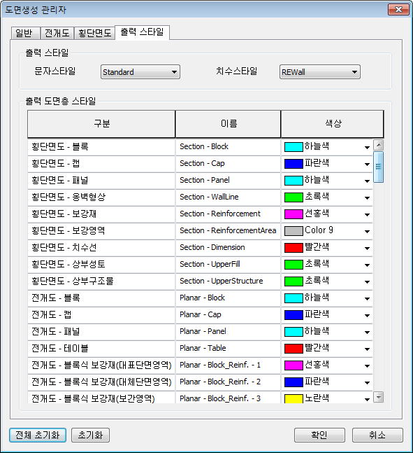 - 출력되는 도면에 적용 할 문자/치수 스타일과 각 도면층의 이름/색상을 설정합니다.