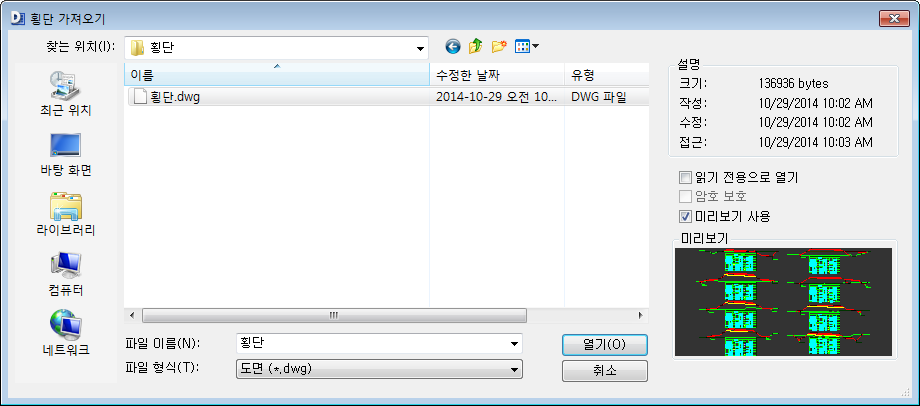 - 기존 횡단 도면파일을 가져오기 위해, 파일 브라우저 대화상자가 표시됩니다.