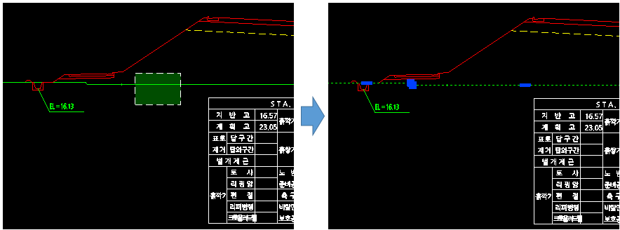 - 지반선으로 등록된 도면층 소속의 객체들은 횡단 정보 등록 시에 옹벽 형상 계획의 하단 기준으로 사용 됩니다.