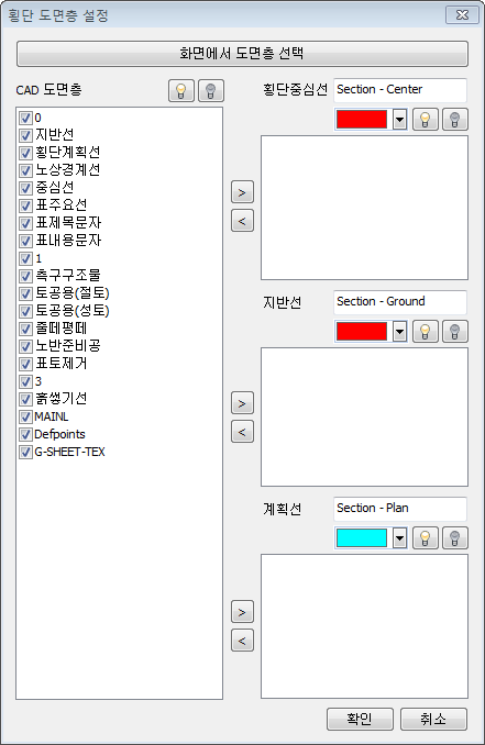 - 이 도면층들 중 횡단중심선, 지반선, 계획선에 해당하는 도면층들을 설정하기 위한 기능입니다.