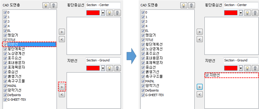 - 이렇게 등록할 도면층을 하이라이트 한 후에 화살표 버튼을 눌러 횡단중심선, 지반선, 계획선에 도면층을 등록합니다.