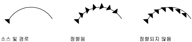 | 방향 | 선택한 객체가 경로의 시작점으로 이동되기 전에 경로의 시작 방향을 기준으로 방향이 조정되는지 여부를 조정합니다. |