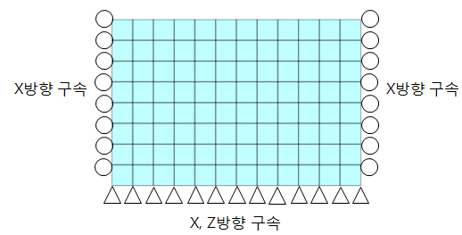 - 지반해석시 경계조건 생성방식: 일반적인 지반해석시 아래 그림과 같이 모델의 좌/우측은 X방향 구속(roller), 하부는 X, Z방향 구속(hinge)조건을 설정하여 해석을 수행합니다.