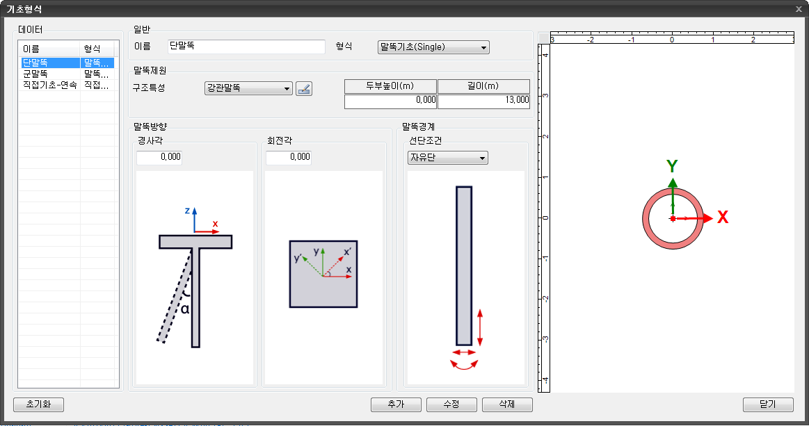 - 단일 말뚝기초의 형상 및 크기를 지정합니다.