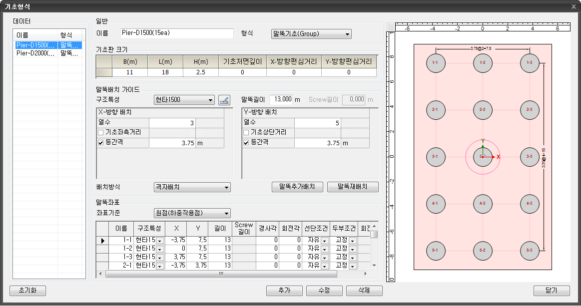- 배치된 말뚝의 최하단에 위치한 말뚝의 중심으로부터 말뚝의 좌표값이 설정됩니다.