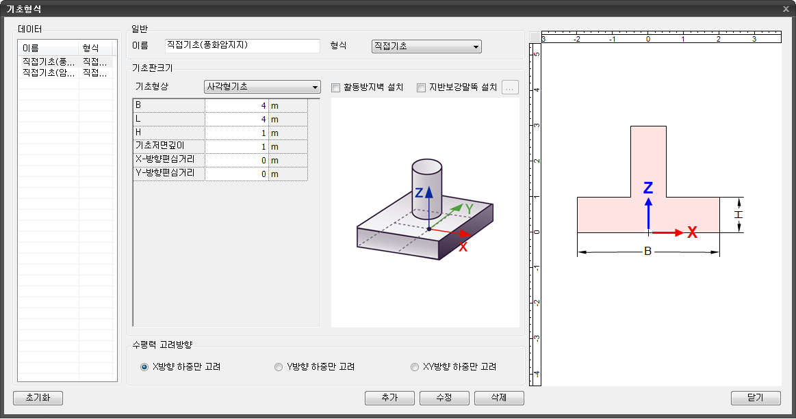| 기능 | 직접기초 및 말뚝기초의 지지력산정을 위한 기초형식/형상을 정의합니다. 기초판의 크기, 말뚝의 종류 및 말뚝의 배치를 설정합니다. |