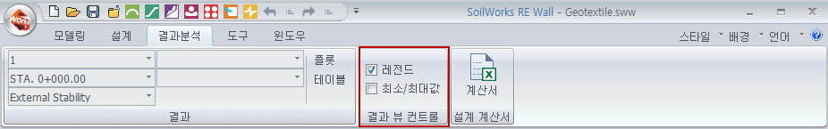결과뷰컨트롤 Home > SoilWorks > 결과분석 > 결과 뷰 컨트롤 > 결과뷰컨트롤 개요 내적안정 결과를 뷰에서 확인할 때 , 레전드를 show/hide 하거나, 결과값 중 최소/최대값을show/hide 할 수 있는 옵션입니다. 최종 수정일: 2026-03-25