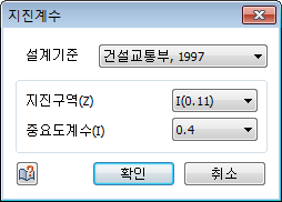 - 지진시 외적/내적 안정 검토에 필요한 최대가속도 계수(Am)를 구하기 위한 최대 지반가속도계수(A)를 입력합니다. 설계기준에서 제공하고 있는 지진구역과 중요도계수를 선택하여 자동계산 할 수도 있습니다.