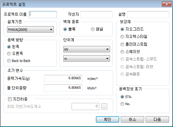 프로젝트설정 Home > SoilWorks > 모델링 > 보강토옹벽 형상계획 > 프로젝트설정