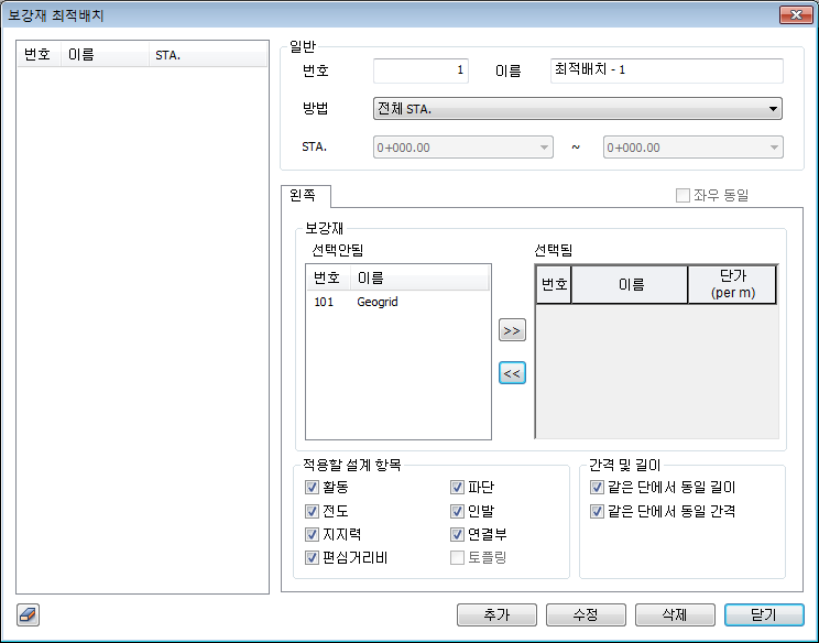 | 방법 | '전체 STA.', '부분 STA.' 을 선택할 수 있습니다.'전체 STA.' 은 옹벽형상계획에 정의된 전체 구간에 대해 보강재를 배치하게 되고, '부분 STA.' 은 시점구간과 종점구간을 정의하여 보강재를 배치하게 됩니다. |