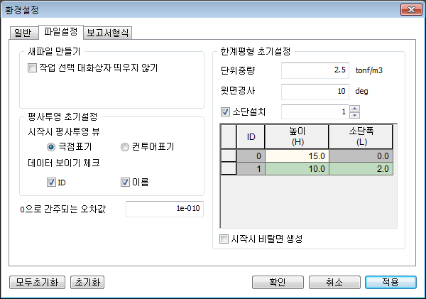 - 비탈면 생성 대화창에 입력되는 비탈면 형상정보의 초기값을 변경할 수 있으며, 한계평형법 파일 생성시 자동으로 비탈면 생성여부를 결정합니다.