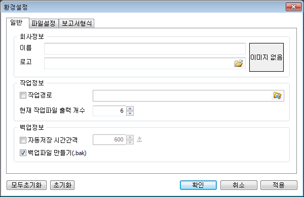 - 회사정보, 작업경로, 백업정보등 파일관리의 일반적인 부분을 설정합니다.