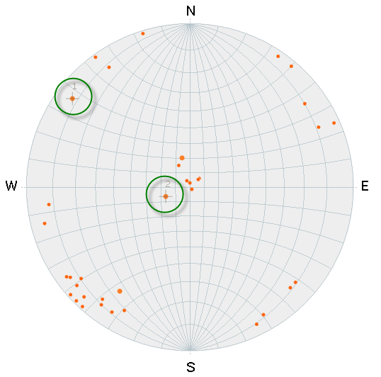 | 지점 | 작업설정에서 선택된 절리방향 기준이 출력되고 상태표시줄(Status bar)에서 침강방향/침강각 기준으로 변경할 수 있습니다. 마우스 포인터 위치에 따라 절리방향 기준에 따른 위치정보가 실시간으로 출력됩니다. 첫번째, 두번째 지점을 연속으로 선택하면 두 지점 사이의 두 직선 사잇각이 즉시 계산됩니다. 직접 수치를 입력할 경우, 수치범위를 벗어난 방향/각도 입력 시 (ex) -230, 370.) 방향은 0~360도 범위 이내, 각도는 0~90도 범위 이내로 자동환산하여 등록됩니다. 참고 두 극점의 벡터 내적에 의해 계산된 사잇각은 합이 180도가 되는 두 개의 각도로 출력합니다. |