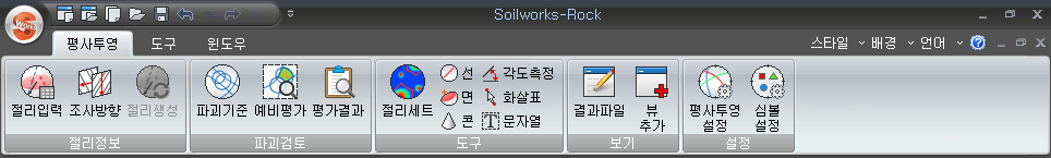 | 미리보기 | 미리보기 버튼 선택 시 파괴영역 내 포함할 절리 혹은 두 절리면의 교차선의 개수가 파괴영역별로 구분되어 출력되고 평사투영망에 Highlight됩니다. |