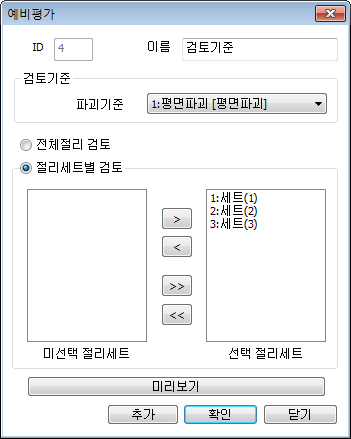 | ID | 정수 형태로 자동 입력됩니다. 추가된 예비평가 삭제 후 다시 입력할 때 최근 입력된 예비평가 ID 이후부터 누적됩니다. 즉, ID는 처음 입력된 예비평가의 고유수치가 됩니다. |