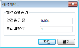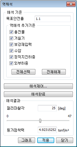 | 해석 | - 해석을 수행합니다. - 해석제어에서 절리마찰각 스텝증가 간격과 안전율 기준을 설정할 수 있습니다. - 안전율 기준은 역해석 수렴조건에 해당하며, 절리마찰각 스텝은 입력된 간격만큼 0부터 증가시키며 반복계산을 수행합니다. |