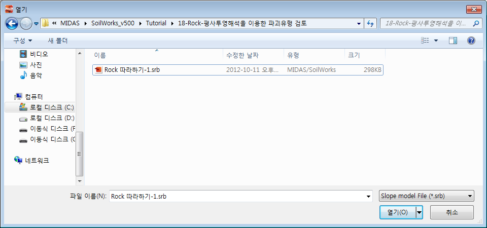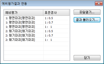 | 파일 열기 | 윈도우 탐색기에서 평사투영 해석결과가 저장된 파일을 엽니다. 한계평형해석 파일이거나, 평사투영 파일 내에 저장된 예비평가 결과가 없을 경우 해석된 결과가 없다는 오류메시지가 출력됩니다. |