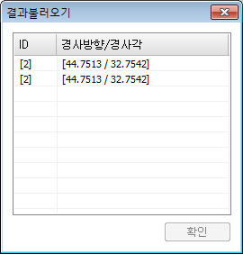 | 결과 불러오기 | 평사투영 파일 내에 저장된 예비평가 결과 리스트가 파괴유형별로 분류되어 출력됩니다. 여러 표준경사(검토케이스)에 대한 결과가 있을 경우 표준경사를 분류탭니다. 이중 연동된 데이터를 선택 후 결과 불러오기를 선택하면 파괴가능영역에 포함할 절리, 혹은 주절리군(절리세트) 정보가 출력됩니다. 해석을 원하는 절리면 정보를 선택하고 확인버튼을 누르면 비탈면, 절리면 모델을 자동 생성하고 안전율을 계산합니다. 참고 비탈면, 절리면 형상정보(방향, 각도)만을 불러오기 하여 계산된 안전율이기 때문에 절리면의 강도특성, 보강재, 하중 조건에 따른 안전율 변화를 추가로 변경하여 확인하여야 합니다. |