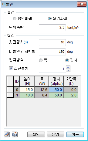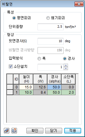 | 입력방식 | 비탈면 형상을 정의할 때 사용되는 편의기능입니다. 비탈면의 폭, 혹은 경사 중 하나를 선택하면 선택한 항목에 따라 다른 항목은 비탈면 높이에 의해 자동 계산됩니다. 참고 비탈면 경사는 90도 이상이 될 수 없습니다. 이는 직접전도 혹은 직접전도와 미끄러짐이 동시에 발생하는 파괴로 한계평형 이론을 적용하여 안전율을 계산해서는 안되는 파괴유형입니다. |