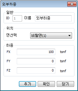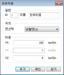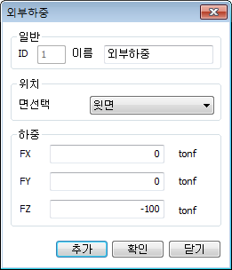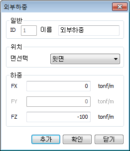 | ID | - 정수형태로 자동 입력됩니다. - 추가된 외부하중 삭제 후 다시 입력할 때 최근 입력된 외부하중 ID 이후부터 누적됩니다. - 즉, ID는 처음 입력된 외부하중의 고유수치가 됩니다. |