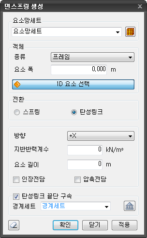 면스프링을 탄성링크 타입으로 생성하는 경우, 인장전담 / 압축전담 옵션을 설정할 수 있습니다.