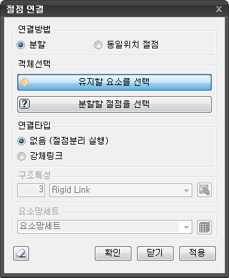 | 기능 | 공유되어 있는 절점의 연결을 끊거나 강체와 같은 링크요소를 생성할 수 있습니다. |