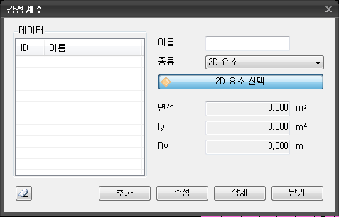 | 호출 | 메인메뉴 : 모델 > 재질속성 > 강성계산 ![]() |