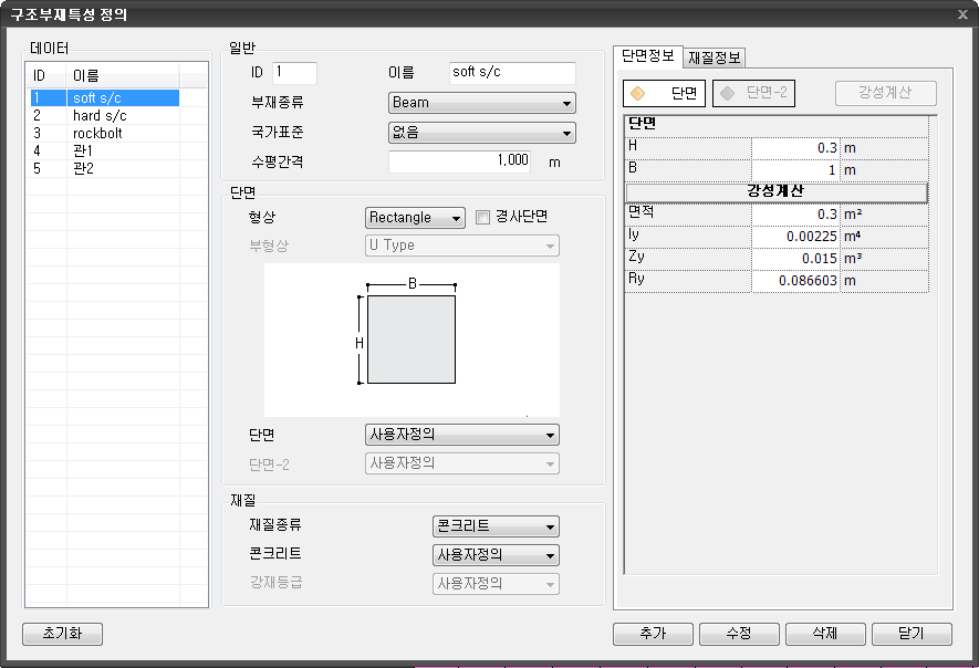 - 입력된 구조부재특성이 표시됩니다. 데이터를 선택해 수정할 수 있습니다.