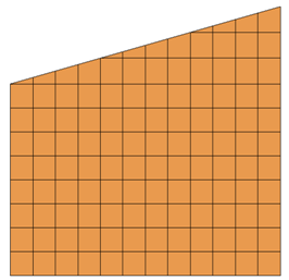 • 사다리꼴 형상 허용에 체크하면 수평선이 경사진 변에 닿지 않는 영역에도 수직선을 그어 수직/수평 일정한 간격으로 요소를 생성할 수 있기 때문에, 아래 그림과 같이 영역이 분할되며 경사진 변에 닿는 요소들은 삼각형 또는 사각형(사다리꼴)으로 생성됩니다(예 1 참조).