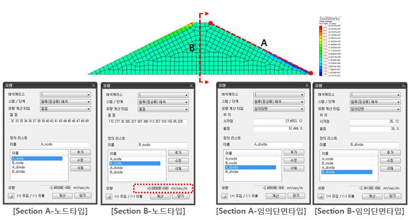 - 선택한 절점이나 임의 단면을 등록하여 정의된 리스트의 유량을 계산합니다.