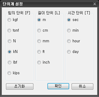 클릭하는 경우 단위계가 기본값(kN, m, sec)으로 변경됩니다. -