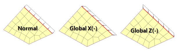 방향설정: 법선방향 하중의 경우 입력 대상의 바깥쪽에서 작용하는 방향이 +로 되며, Global X, Global Z 방향의 경우 좌표계의 +, -에 따라 부호를 입력할 수 있습니다.
