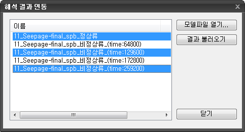 모델파일에서 해석케이스 및 단계별로 결과를 불러옵니다. 수위가 고려된 경우에는 간극수압 결과까지 불러오게 됩니다.