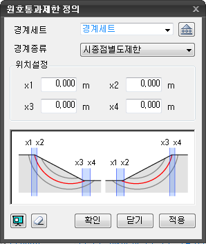 | 호출 | 메인메뉴 : 한계평형법 > 경계 > 원호통과제한 Command : LimitCircularSurface" |