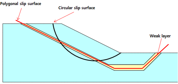 - 따라서 이 경우 원호 파괴면을 탐색하여 사면의 안전율을 산정하는 것은 올바르지 못한 방식이며, 지배적인 활동면(연약층을 통과하는 파괴선)을 설정하여 안전율을 산정해야 합니다.