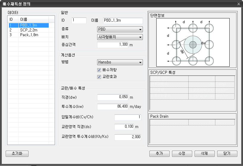 클릭하는 경우 작성된 배수재특성이 변경됩니다.- 클릭하는 경우 작성된 배수재물성이 삭제됩니다.