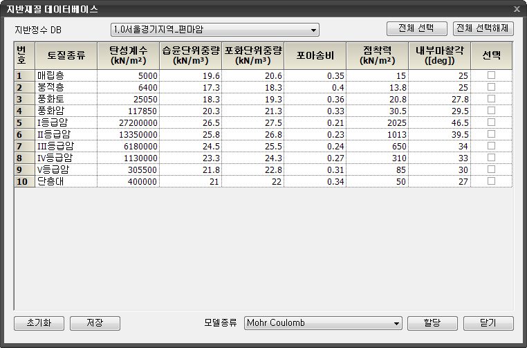 사용자가 지반물성을 편리하게 입력할 수 있도록 대표적인 물성에 대해 데이터베이스를 제공하기 위한 기능입니다. 클릭하는 경우 지반재질 데이터베이스 대화상자가 호출됩니다.