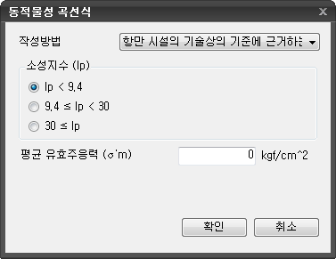 동적 곡선식 사용 : 기존의 다양한 데이터베이스로부터 물성값을 정의합니다. 아래의 대화창들은 각각 일본 토목연구소의 식, 항만시설 기술상의 기준, Yasda의 방법 그리고 액상화 메뉴얼에 의한 데이터베이스 선택을 나타내고 있습니다.