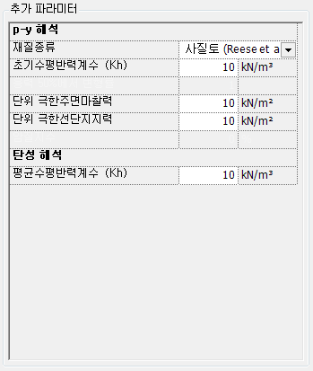 - 재질종류 : 사질토 (Reese et al.)와 사질토(API)에 대해 선택이 가능합니다.