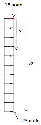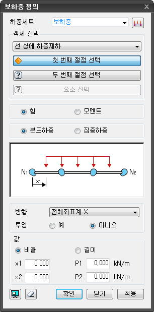 첫 절점과 두 번째 절점을 선택한 후 x1의 위치, x2의 위치에 하중의 크기를 입력하여 생성합니다. x1, x2의 위치는 비율로 입력하거나 절대길이로 입력할 수 있습니다.