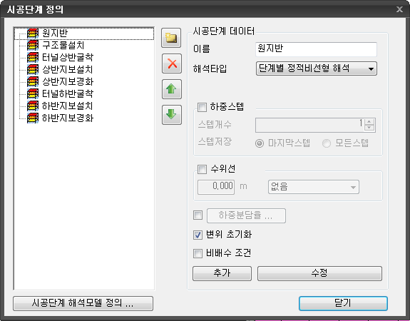 클릭하여 시공단계 해석모델 대화상자를 호출합니다.