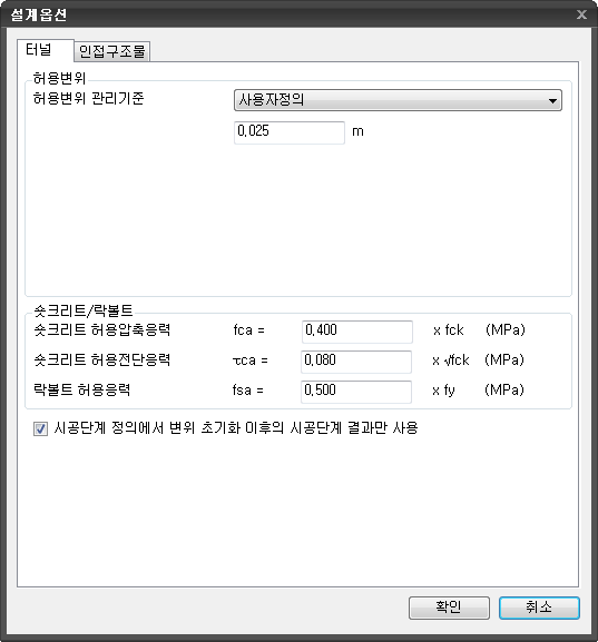 설계 옵션(터널 모듈) Home > SoilWorks > 터널(Ground) > 해석 & 설계 > 설계 및 보고서제어 > 설계 옵션(터널)