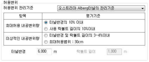- 평가기준을 선택하고 활성화된 변수(터널반경, Rockbolt길이)를 입력하여 허용변위량을 결정합니다.