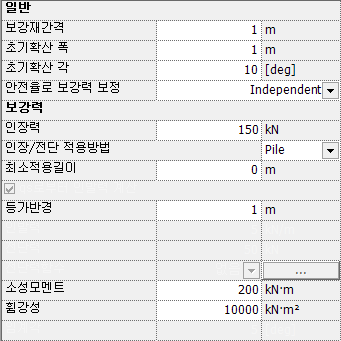 초기확산 폭 : 보강재의 확산효과를 고려하기 위한 폭을 입력합니다. 일반적으로 Nail/Pile 지압판의 폭(지압판이 없는 경우 Nail/Pile 직경과 같은 값을 입력하거나 0을 입력하여도 무방함)을 사용합니다.