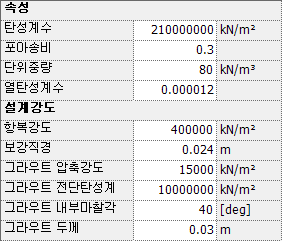 인발력 : 인발시험 강도를 입력합니다. 시험값이 없는 경우 인장력과 같은 값 또는 큰 값을 입력합니다. (인장력과 인발력 중 작은 값이 보강력으로 계산됨)