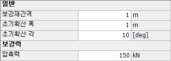 초기확산 각 : 보강재의 확산효과를 고려하기 위한 각을 입력합니다. Strut 설치로 인해 발생하는 응력의 분포각으로, 실험을 통해 값을 얻어내지 않으면 보통 10~15도의 값을 사용합니다.