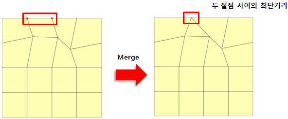 선택한 두 절점 사이의 최단거리로 절점이 병합됩니다. 두 절점 가운데 절점번호가 작은 절점을 기준으로 병합됩니다. 번호가 작은 절점이 유지됩니다.