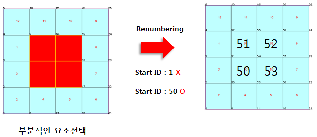 그러나 부분적인 요소를 선택하여 절점 / 요소번호를 재정렬하는 경우, 사용자가 입력한 시작번호가 선택하지 않은 요소에 이미 할당되어 있는 경우 재정렬할 수 없으며, 선택되지 않은 요소에 할당되지 않은 번호를 시작번호로 입력해야 재정렬할 수 있습니다.